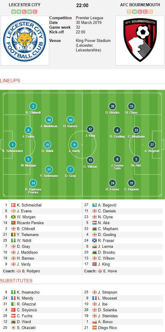 AEGoal.net chốt kèo trực tiếp trận Leicester City vs Bournemouth diễn ra lúc 22h00 ngày 30/3 sau khi dựa trên tính toán, chuyển động về kèo châu Á và đội hình ra sân của 2 đội.