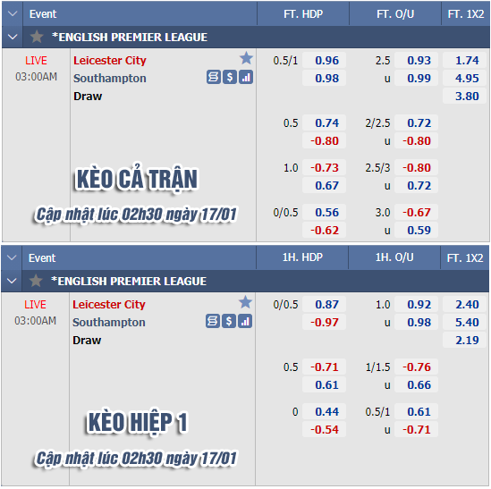 * Chốt kèo trận Leicester City vs Southampton (03h00 ngày 17/1)