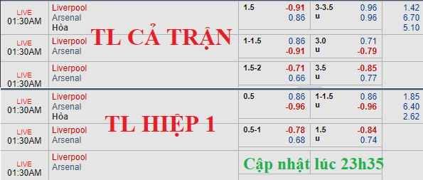 Niềm tin mà giới đầu tư dành cho Liverpool ngày càng gia tăng và tỷ lệ chính đã có biến động không hề nhỏ. Nếu như ở phiên khớp lệnh sáng ngày 29/12 Liverpool "chỉ" chấp 1 1/4 thì sau khi đôi bên công bố đội hình ra sân, chủ nhà có tỷ lệ chấp lên tới 1 1/2. Đây là cột mốc lần đầu tiên xuất hiện khi 2 đội đụng độ và rõ ràng nó mang đến sự khả quan dành cho thầy trò Jurgen Klopp.