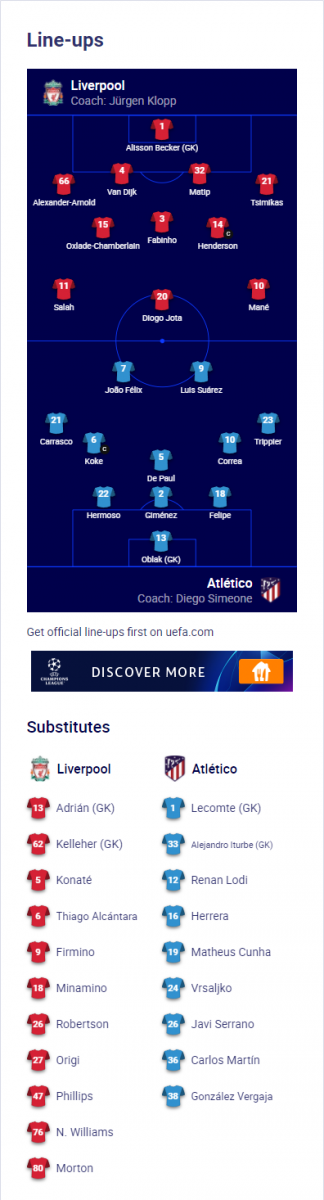 - Liverpool: Alisson; Alexander-Arnold, Matip, Van Dijk, Robertson; Jones, Henderson, Oxlade-Chamberlain; Salah, Jota, Mane