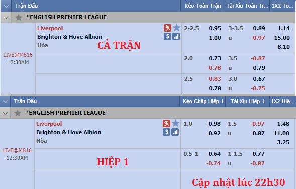 Chốt kèo Liverpool vs Brighton (23h30)