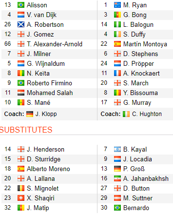 Liverpool (4-3-3): Alisson - Alexander-Arnold, Gomez, Van Dijk, Robertson - Milnerm Henderson, Keita - Mane, Firmino, Salah.