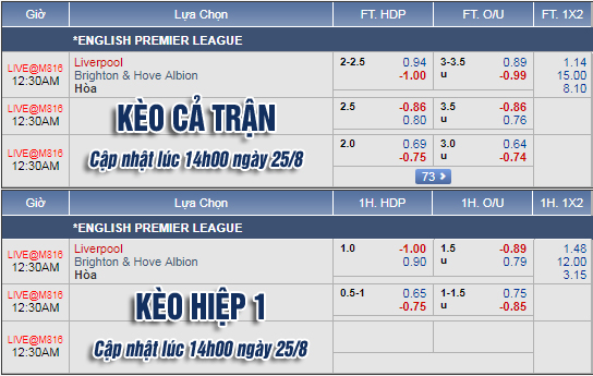 CHỐT KÈO trực tiếp trận Liverpool vs Brighton, 23h30 ngày 25/8: Khó có bất ngờ