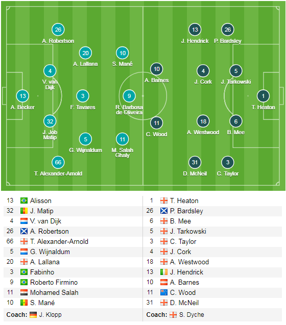Tung ra đội hình mạnh nhất ở trận này, Liverpool rõ ràng đang tỏ ra rất thận trọng ở trận đấu này, đặc biệt là khi trước đó Man City đã có chiến thắng trước Watford và tạo ra khoảng cách 4 điểm trên BXH, chính vì thế mục tiêu của Lữ đoàn đỏ chắc chắn sẽ là 1 chiến thắng. Tuy nhiên để có 1 chiến thắng đậm hay không lại là chuyện khác, nhất khi Burnley chủ động chơi thấp ở trận này.
