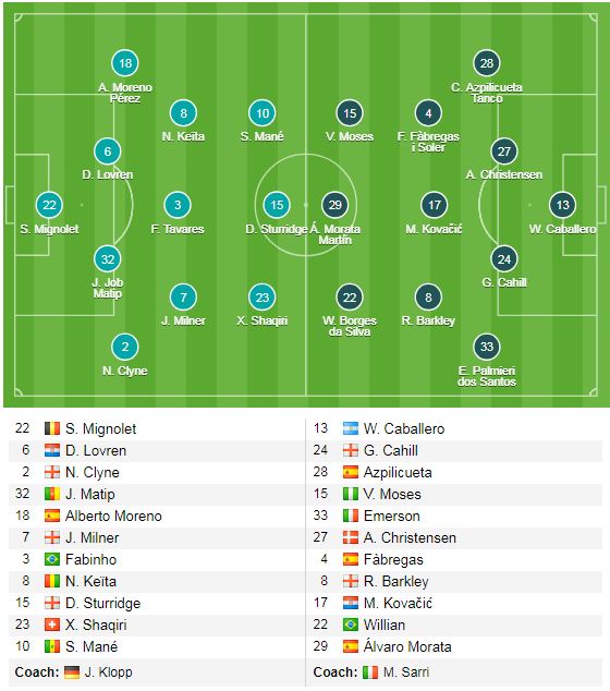 Chelsea (4-3-3): Caballero; Emerson, Christensen, Cahill, Zappacosta; Barkley, Ampadu, Loftus-Cheek; Hudson-Odoi, Morata, Moses.
