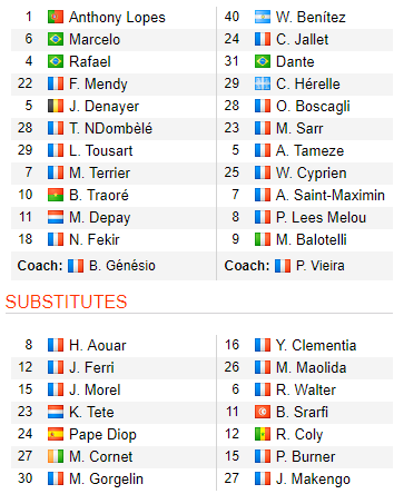 Lyon (4-3-1-2): Lopes - Mendy, Morel, Marcelo, Rafael - Aouar, Tousart, NDombele - Fekir - Terrier, Traore.
