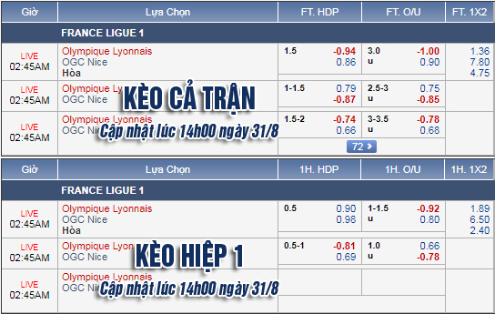 AEGoal.net chốt kèo trực tiếp trận Lyon vs Nice sau khi dựa trên tính toán, chuyển động về kèo châu Á và đội hình ra sân của 2 đội.
