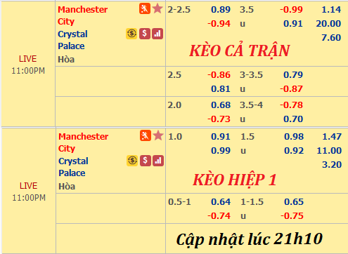 AEGoal.net chốt kèo trực tiếp trận Man City vs Crystal Palace diễn ra lúc 22h00 ngày 22/12 sau khi dựa trên tính toán, chuyển động về kèo châu Á và đội hình ra sân của 2 đội.