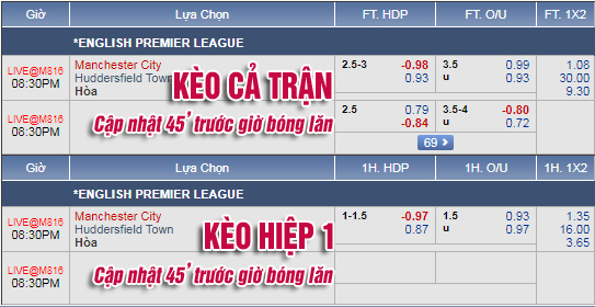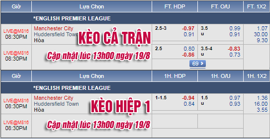 * Chốt kèo trận Man City vs Huddersfield (19h30)