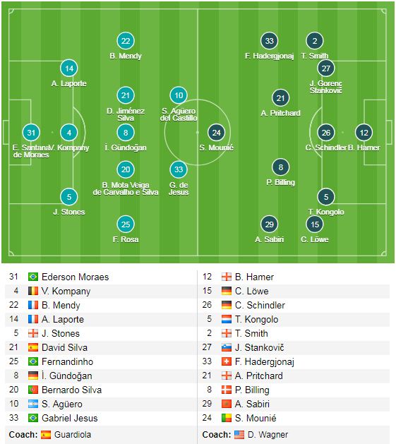 Man City (4-3-3): Ederson - Mendy, Laporte, Stones, Walker - Silva, Fernandino, Gundogan - Sterling, Jesus, Mahrez.
