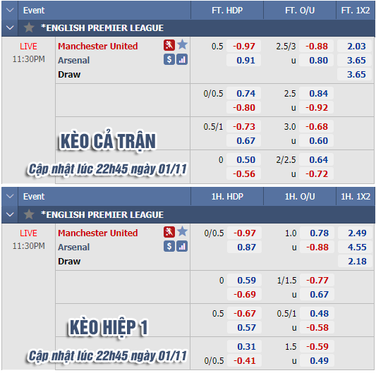 AEGoal chốt kèo bóng đá trực tiếp trận Man Utd vs Arsenal diễn ra lúc 23h30 ngày 1/11 trong khuôn khổ giải Ngoại hạng Anh sau khi dựa trên tính toán, chuyển động về kèo châu Á và đội hình ra sân của 2 đội.