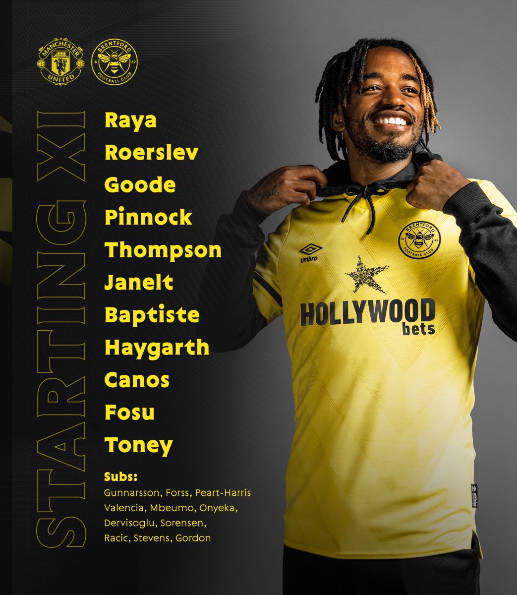 - Brentford: Raya; Ajer, Pinnock, Goode; Stevens, Janelt, Oksanen, Thompson; Canos, Toney, Valencia.