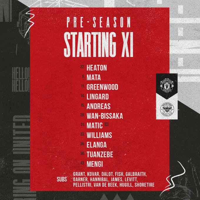 - Manchester Utd: Heaton; Wan-Bissaka, Mengi, Tuanzebe, Williams; Garner, Matic, Mata; Elanga, Greenwood, Lingard.