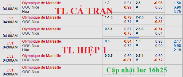 Không có quá nhiều biến động về giá ở kèo chấp 1 hòa của Marseille, đội chủ nhà vẫn nhận giá trị ăn khoảng 0.94, trong khi đội khách khoảng 0.98. Ở mức kèo tài xỉu 2 1/2, cửa tài giảm giá mạnh từ -0.96 vào buổi chiều nay, chỉ còn 0.87 sau khi đôi bên công bố đội hình ra sân, cho thấy cửa Tài được tin tưởng hơn.