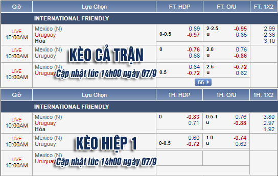 Chơi trên sân trung lập, nhưng Uruguay chỉ được niêm yết tỷ lệ chấp 1/4 trước Mexico, rõ ràng đội bóng Nam Mỹ không nhận được quá nhiều sự tin tưởng. Kèo chấp nói trên được giữ nguyên, thậm chí giá ăn cũng được bảo toàn. Mexico dù không có nhiều ngôi sao như Vela, Chicharito... nhưng lứa trẻ của nước này lại đầy khát khao.