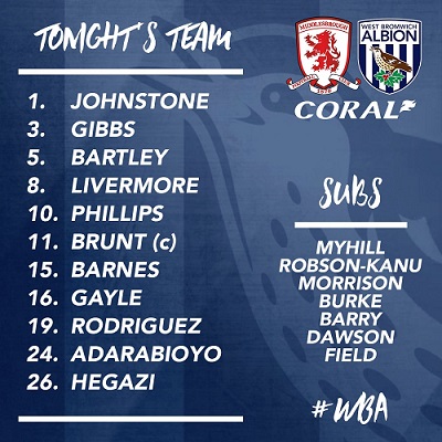 West Brom (3-4-1-2): Johnstone; Adarabioyo, Bartley, Hegazi; Gibbs, Brunt, Livermore, Phillips; Barnes; Rodriguez, Gayle.
