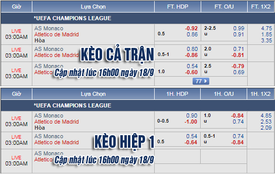 AEGoal.net chốt kèo trực tiếp trận Monaco vs Atletico Madrid sau khi dựa trên tính toán, chuyển động về kèo châu Á và đội hình ra sân của 2 đội.