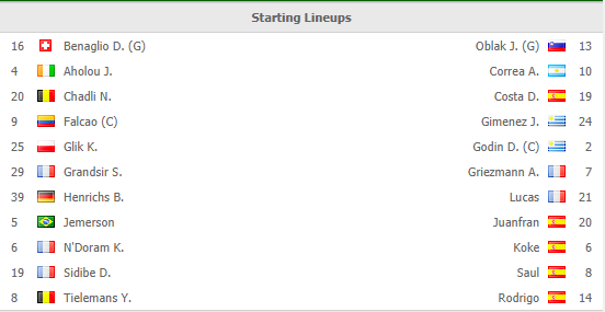 Trong khi Monaco tung vào sân đội hình mạnh nhất của họ vào thời điểm này thì bên phía Atletico Madrid, HLV Simeone quyết định cất Filipe Luis và Thomas Lemar trên băng ghế dự bị. Chính vì điều đó mà ngay sau khi có đội hình ra sân, điểm ăn cho cửa Atletico bỏ sâu hơn so với trước đó.