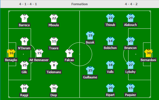 Monaco (4-1-4-1): Benaglio - Barreca, Raggi, Glik, Toure - Bennasser - Chadli, Tielemans, Aholou, Mboula - Falcao.