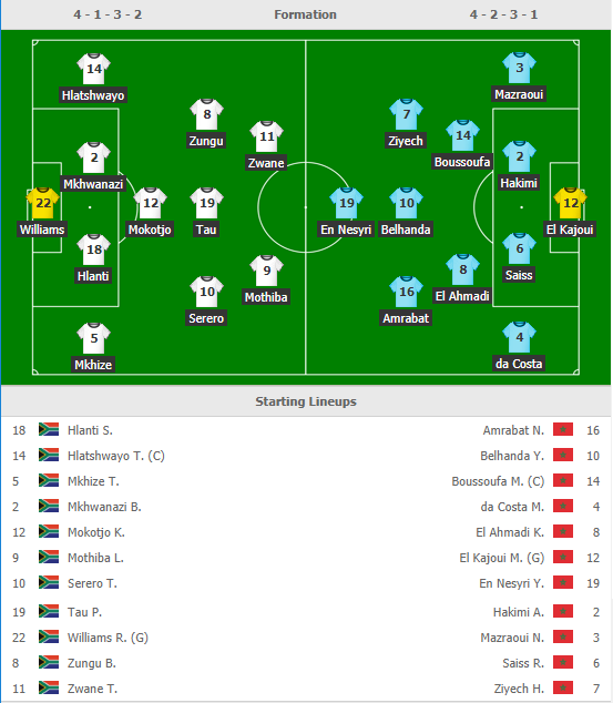 Trái với dự đoán của nhiều người, dù đã chắc chắn có mặt ở vòng knock-out nhưng Morocco ra sân với đội hình khá mạnh, những ngôi sao như Ziyech, Amrabat, Belhanda hay Hakimi vẫn có tên trong đội hình xuất phát. Morocco vẫn đá với sơ đồ 4-2-3-1 trong khi Nam Phi chơi 4-1-3-2 bởi họ buộc phải thắng trận này.