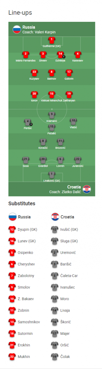 Croatia (4-3-3): Dominik Livakovic; Josko Gvardiol, Domagoj Vida, Duje Caleta-Car, Borna Sosa; Marcelo Brozovic, Mateo Kovacic, Mario Pasalic; Nikola Vlasic, Andrej Kramaric, Ivan Perisic.