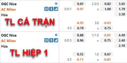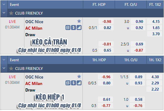 * Chốt kèo trận Nice vs AC Milan (01h30 ngày 01/8)