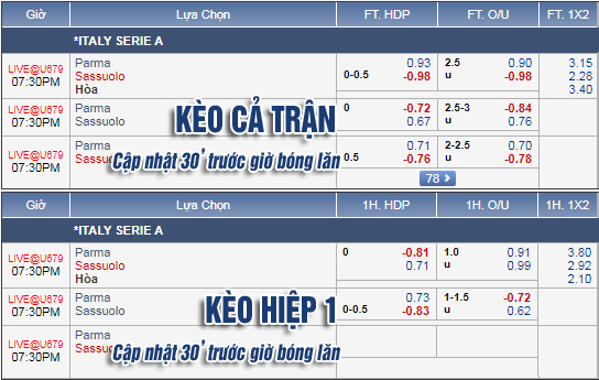 * Chốt kèo trận Parma vs Sassuolo (18h30)