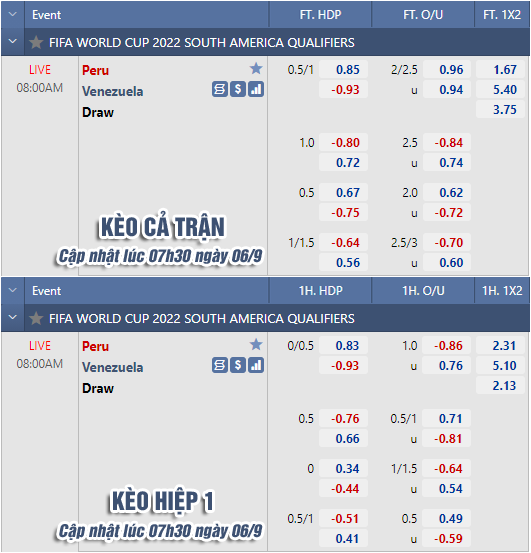Trên sàn giao dịch châu Á, Peru vẫn duy trì được vị thế của mình với kèo chấp 3/4 cùng điểm ăn thấp, qua đó cùng củng cố niềm tin vào 1 kết quả thuận lợi. Trong khi kèo tổng bàn thắng cũng vẫn duy trì ở mức 2 1/4 nên cũng khó hy vọng vào 1 sự bùng nổ.