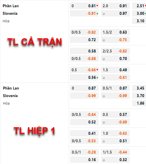 Tỷ lệ của Phần Lan có xu hướng giảm điểm so với trước đây, hiện tại tỷ lệ chính của trận đấu được duy trì ở mức 0:0 thay cho tỷ lệ chấp 1/4 của Phần Lan ở thời điểm sáng nay. Bên phía tỷ lệ tài xỉu của trận đấu, mốc 2 hoà tiếp tục duy trì là mốc tài xỉu chính của trận đấu, điểm ăn của cửa xỉu đã được điều chỉnh giảm nhưng không nhiều.