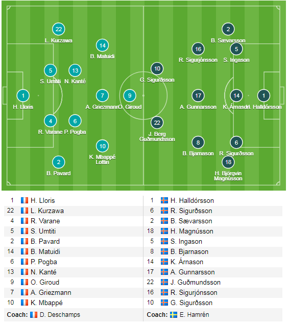 Phải chơi trên sân của nhà ĐKVĐ Thế giới, không quá ngạc nhiên khi Iceland chủ động ra sân với đội hình thiên về phòng ngự 5-3-2, trên thực tế đây cũng là sở trường của đội bóng xứ Băng đảo. Tuy nhiên, trước 1 ĐT Pháp với đầy đủ các ngôi sao vừa lên ngôi ở World Cup vừa qua, Iceland sẽ khó lòng chống trọi hết 90 phút của trận đấu.