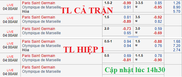 PSG được niêm yết tỷ lệ chấp lên tới 1 3/4 trước Marseille và theo thời gian, mức giá ăn của PSG thậm chí còn giảm nhẹ. Kèo sâu cộng với giá ăn giảm cho thấy PSG đang nhận được những tín hiệu phản hồi tích cực từ thị trường.