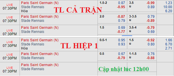 Hiện tại tỷ lệ chấp chính của PSG trên sàn giao dịch châu Á đã tăng lên 2 hoà so với tỷ lệ chấp 1 3/4 ở thời điểm chung tôi cập nhật trưa nay. Bên phía tỷ lệ tài xỉu của trận đấu lại gần như không có biến động nào đáng kể, tỷ lệ chính của trận đấu vẫn đang được nhà cái giữ ở mức 3 1/2.