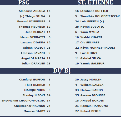 - St Etienne: Romain Hamouma, Mathieu Debuchy (chấn thương).