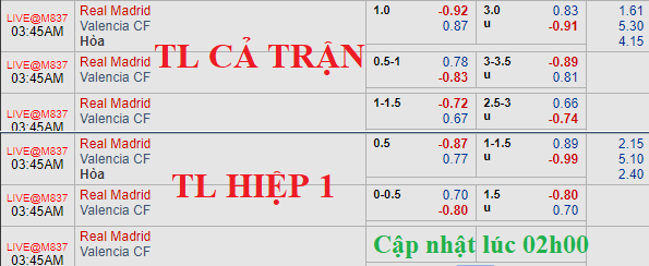 Mức chấp 1 hòa của Real Madrid ngày càng chứng kiến điểm ăn cho cửa trên ở mức bỏ sâu. Trong khi mốc tài xỉu 3 hòa vẫn được giữ nguyên với điểm ăn thấp hơn cho cửa tài. Thực tế ban đầu Real chấp 1 1/4 nhưng họ liên tục mất giá trên thị trường châu Á. Kể cả có giữ nguyên tỷ lệ ban đầu thì cột mốc đó cũng quá thấp so với những lần Real đón tiếp Valencia tại Bernabeu trước đây.