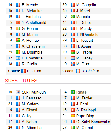 Lyon (4-3-1-2): Gorgelin - Dubois, Marcelo, Morel, Mendy - NDombele, Tousart, Aouar - Depay- Traore, Mariano.