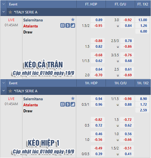 * Chốt kèo trận Salernitana vs Atalanta (01h45 ngày 19/9)