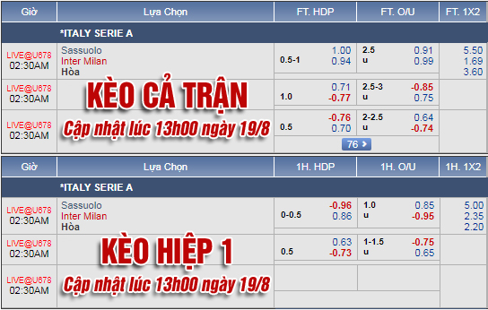 AEGoal.net chốt kèo trực tiếp trận Sassuolo vs Inter Milan sau khi dựa trên tính toán, chuyển động về kèo châu Á và đội hình ra sân của 2 đội.