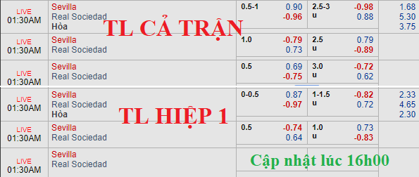 CHỐT KÈO TRỰC TIẾP trận Sevilla vs Sociedad (00h30)