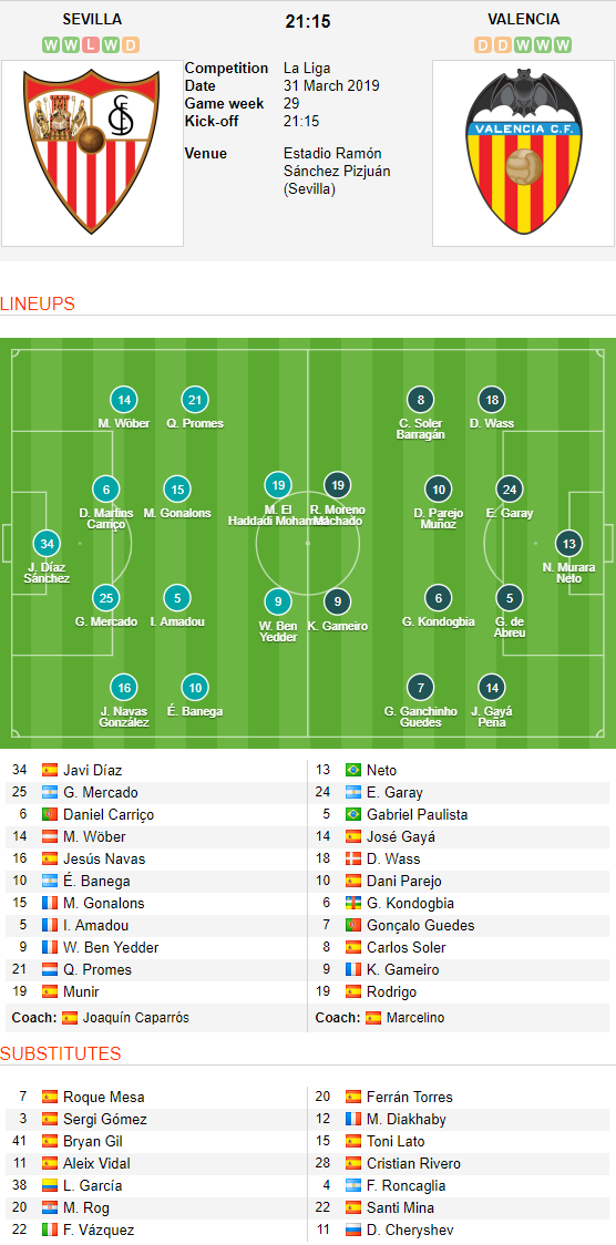 AEGoal.net chốt kèo trực tiếp trận Sevilla vs Valencia diễn ra lúc 21h15 ngày 31/3 sau khi dựa trên tính toán, chuyển động về kèo châu Á và đội hình ra sân của 2 đội.