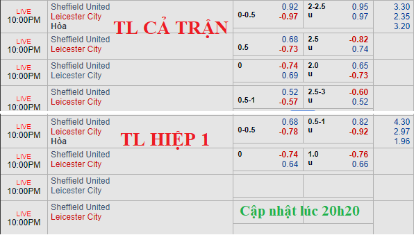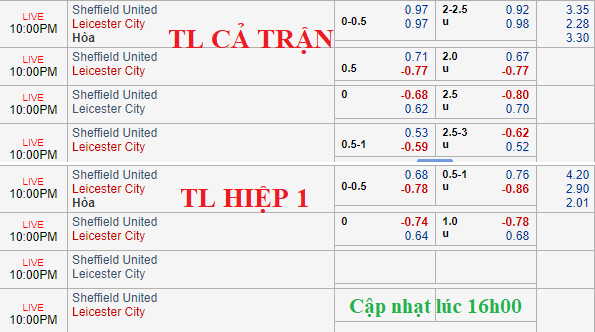 So với thời điểm chiều nay thì trận này chưa chứng kiến sự biến động đáng kể về tỷ lệ, ngay cả khi đôi bên đã công bố đội hình ra sân. Leicester vẫn chấp đồng banh còn mốc tài xỉu vẫn là 2 1/4. Tân binh Sheffield Utd vẫn đang bất bại sau 2 vòng đấu và theo AEGoal thì việc Leicester duy trì được kèo chấp là tín hiệu tích cực.