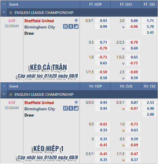 - Trận đấu: Sheffield Utd vs Birmingham (Vòng 1 - Hạng nhất Anh)