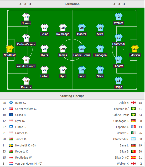 Swansea: Nordfeldt (GK), Roberts, Hoorn, Carter-Vickers, Naughton, Fulton, Grimes, Byers, Dyer, James, Celina