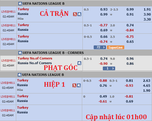 Nga ngày càng lép vế trên thị trường châu Á. Khi trận đấu chuẩn bị diễn ra, chủ nhà của World Cup 2018 đã bị đẩy xuống kèo được chấp 1/2 cùng lợi điểm cân bằng. Đây là biến động khá lớn nếu nhìn vào đầu phiên Thổ Nhĩ Kỳ chấp 1/4 chạm lợi nhuận 0.90.