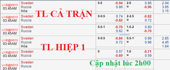 Thụy Điển vẫn ở vị thế cửa trên với kèo chấp hòa nhưng so với thời điểm 12h trưa ngày 20/11 thì giá ăn cho họ đã biến động theo chiều hướng không mấy khả quan (0.95 thành -0.96). Trong khi handicap là vậy thì ở mốc tài xỉu, mức 2 1/4 đã bị kéo về chỉ còn 2 hòa và mức ăn cho cửa tài liên tục có xu hướng tăng nhẹ.