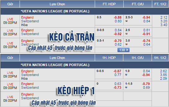 THAM KHẢO: Thụy Sĩ (+1/2) cả trận