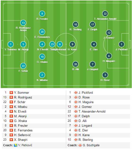 Ở trận đấu này, mặc dù đã có 1 vài thay đổi nhưng về cơ bản những cái tên tốt nhất bên phía Thụy Sĩ đều đã có mặt trong đội hình ra sân như Xhaka, Shaqiri hay Seferović,... cùng sơ đồ có xu hướng thiên về sự chắc chắn 3-5-1-1. Trong khi bên phía ĐT Anh, trên hàng công Harry Kane đã trở lại cùng đá cặp với Alli và Sterling, ở hàng thủ cặp hậu vệ của Liverpool là Gomez và Alexander-Arnold cũng được sử dụng ngay từ đầu.