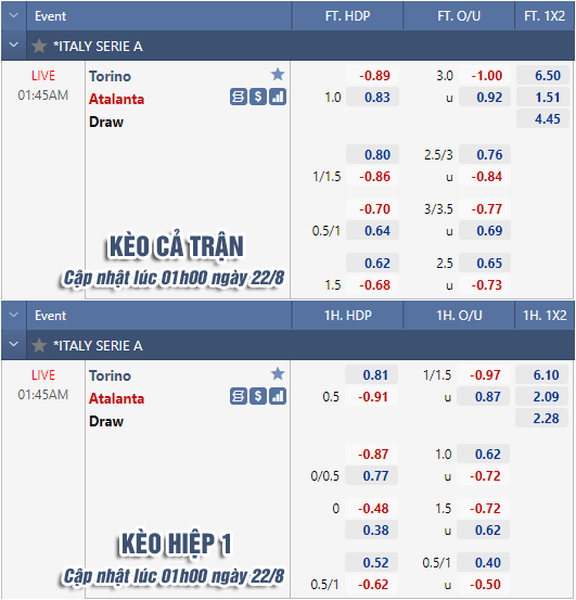 * Chốt kèo trận Torino vs Atalanta (1h45 ngày 22/8)