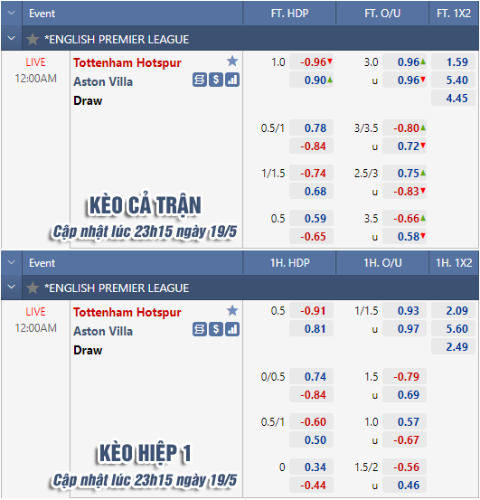 AEGoal chốt kèo bóng đá trực tiếp trận Tottenham vs Aston Villa diễn ra lúc 00h00 ngày 20/5 trong khuôn khổ giải Ngoại hạng Anh sau khi dựa trên tính toán, chuyển động về kèo châu Á và đội hình ra sân của 2 đội.
