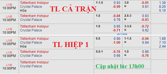 Kèo chính Tottenham chấp 1 1/4 vốn đã bị dự báo rất nguy hiểm lại được điều chinh về mốc điểm lợi nhuận cân bằng hơn, thay vì thấp hơn so với đầu phiên. Trên thực tế, nền tảng thể lực của các cầu thủ chủ nhà gặp nhiều khó khăn khi phần lớn vừa trở về từ đợt tập trung đội tuyển vừa qua. Trong khi Crystal Palace lại khá thảnh thơi và họ sở hữu cá nhân biết tạo ra đột biến như Zaha, Milivojevic hay Ayew.