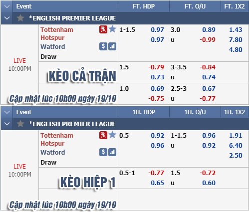 AEGoal.net chốt kèo trực tiếp trận Tottenham vs Watford diễn ra lúc 21h00 ngày 19/10 sau khi dựa trên tính toán, chuyển động về kèo châu Á và đội hình ra sân của 2 đội.